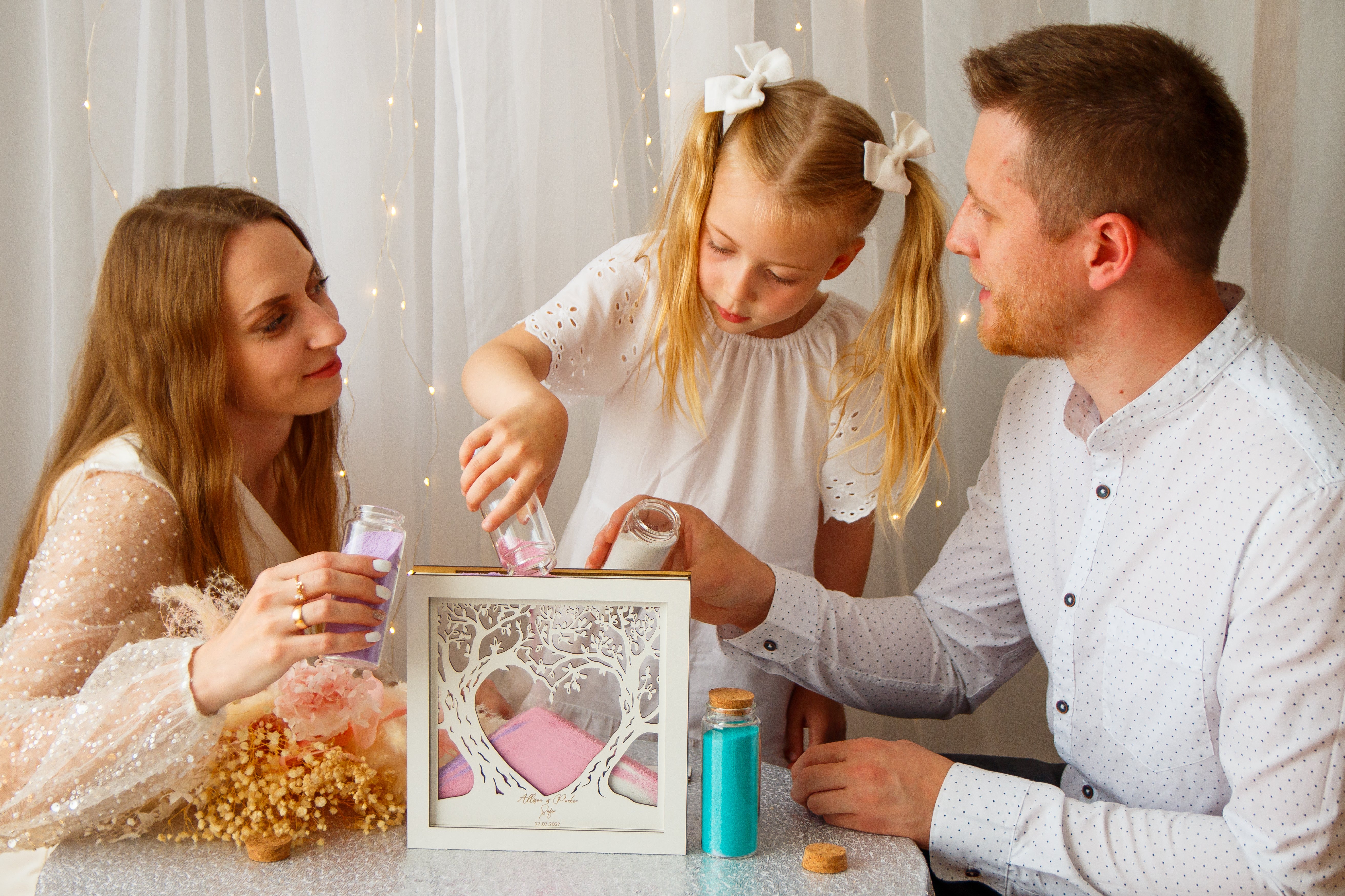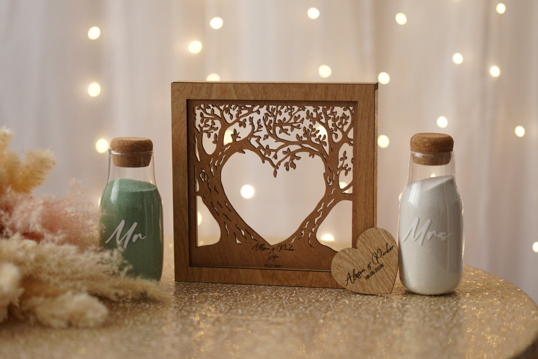 Our signature sand ceremony set, meticulously crafted to symbolize your unbreakable bond. Personalize with your initials and wedding date for a timeless keepsake