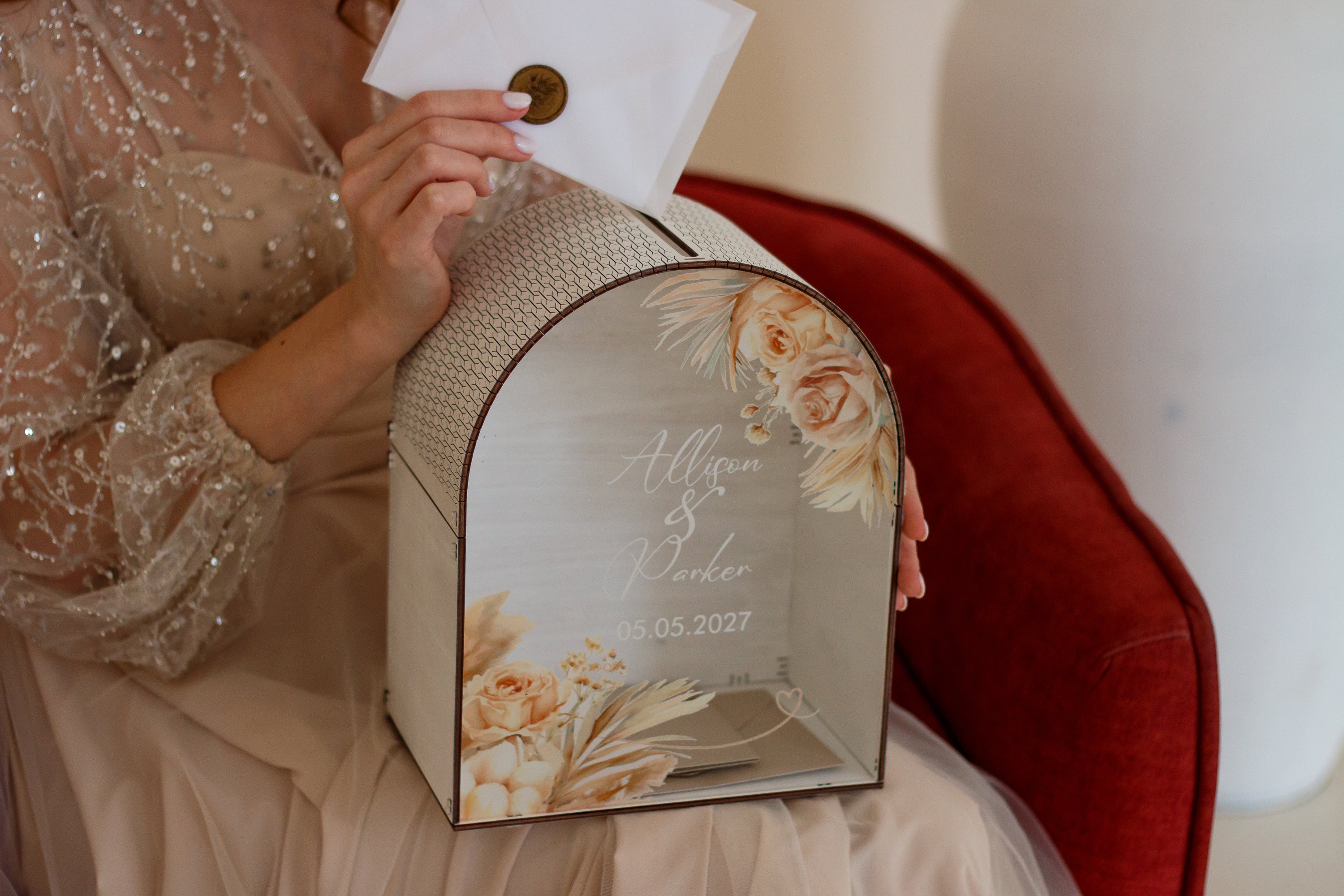 A handcrafted wooden wedding card box with an elegant arched design — where timeless craftsmanship meets modern romance. Each piece is made from premium birch plywood and crystal-clear acrylic, combining natural warmth with refined minimalism.