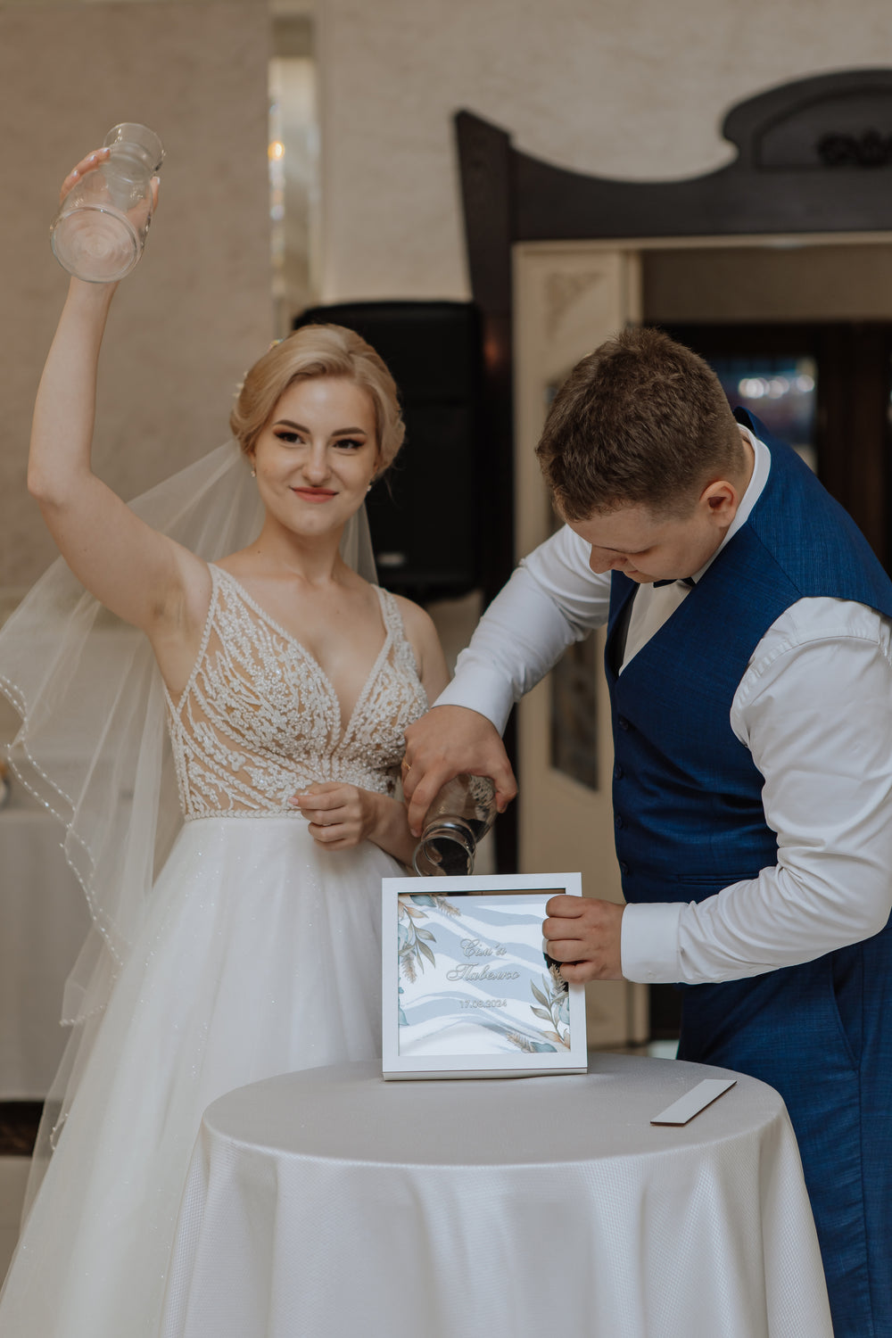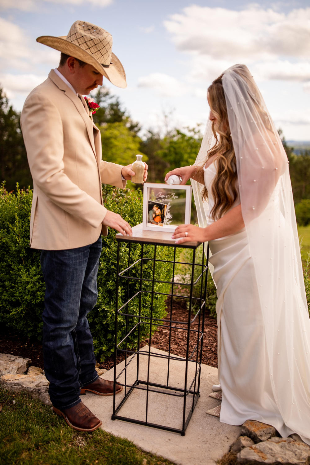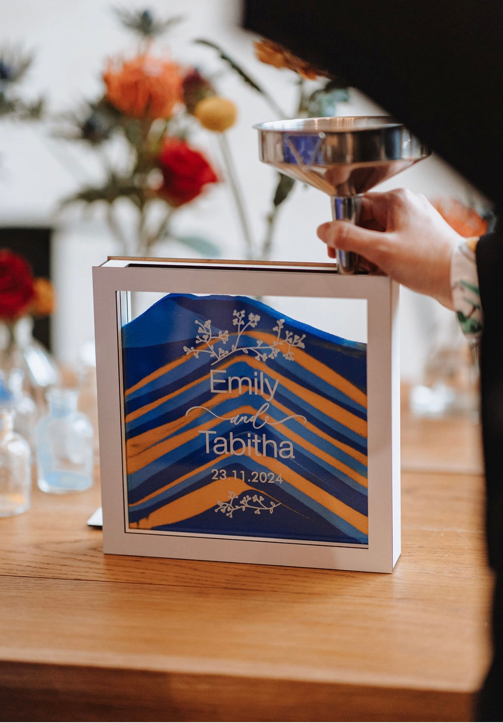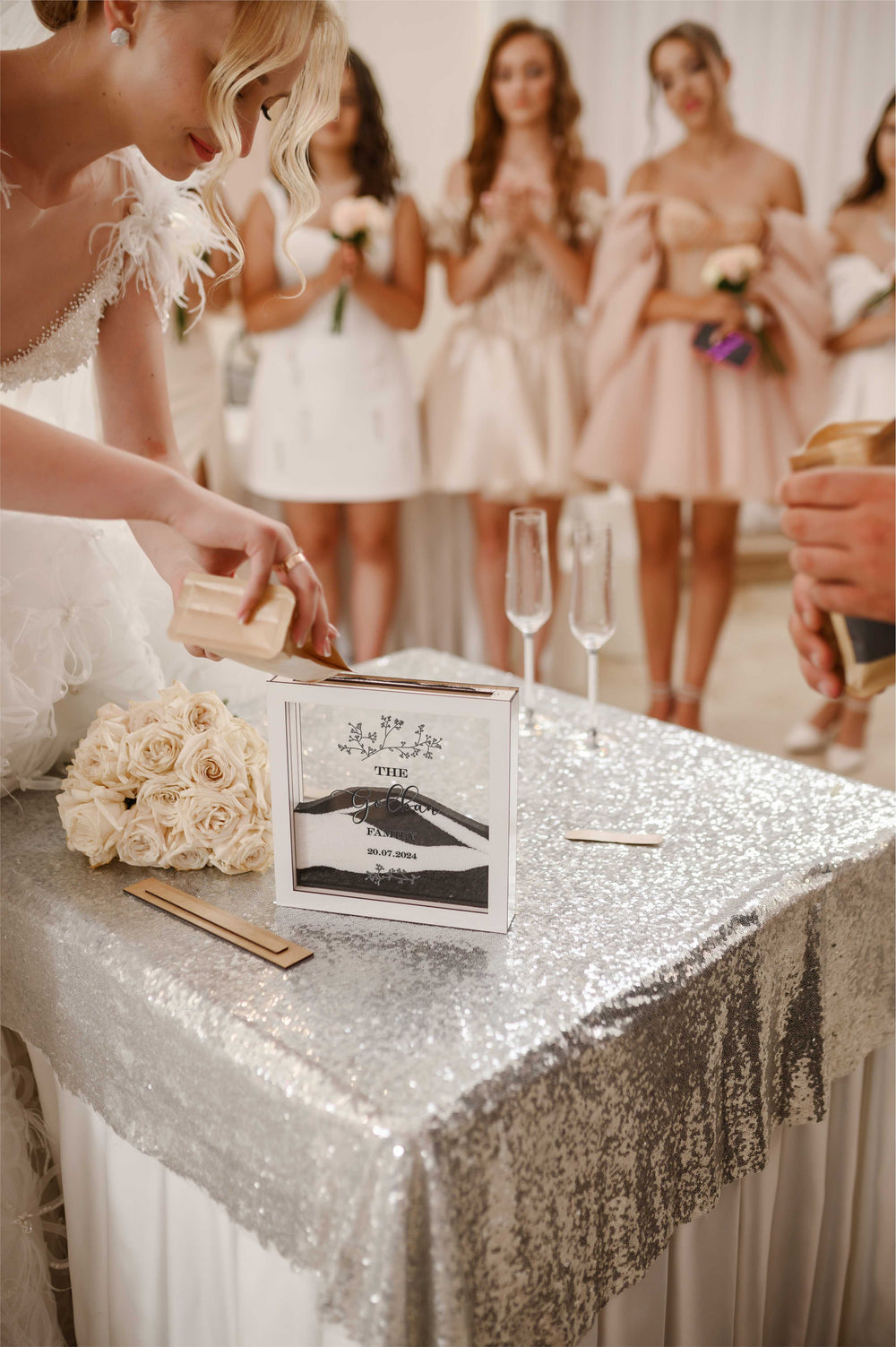 Our signature sand ceremony set, meticulously crafted to symbolize your unbreakable bond. Personalize with your initials and wedding date for a timeless keepsake